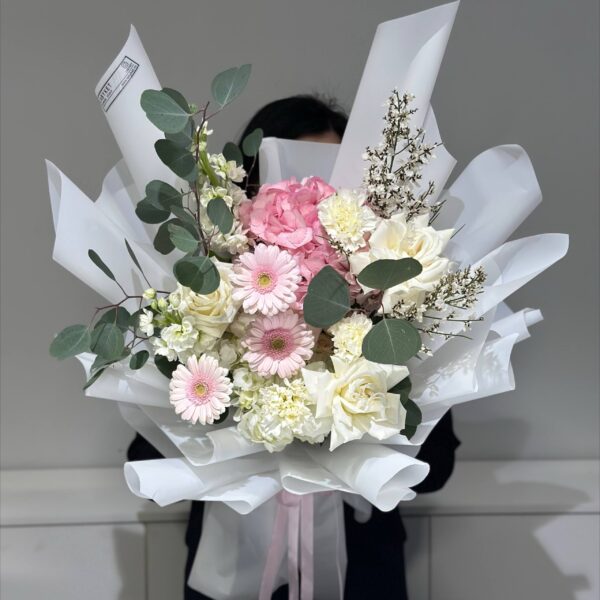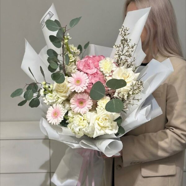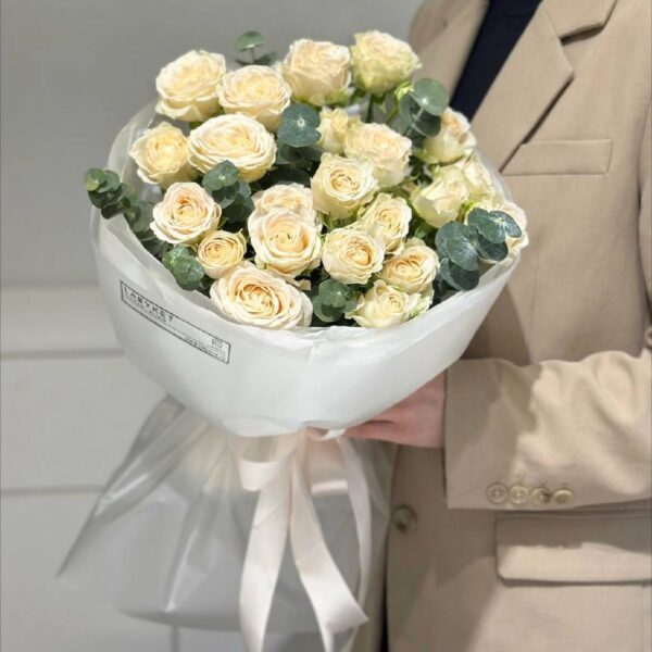 19 белых французских роз с эвкалиптом