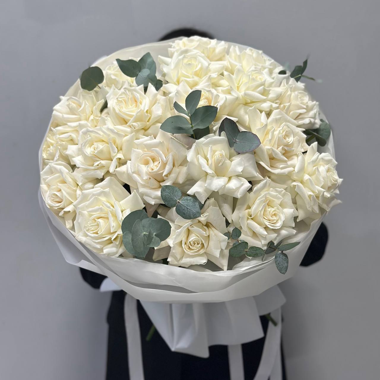 19 белых французских роз с эвкалиптом