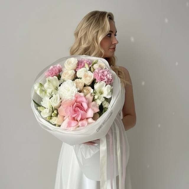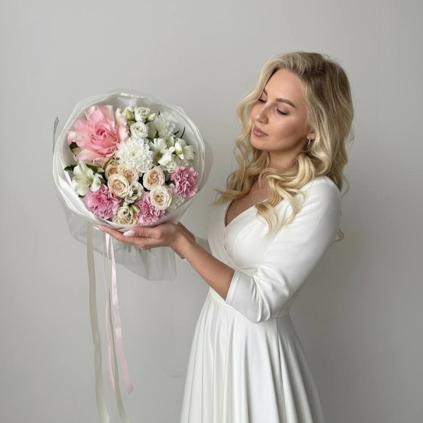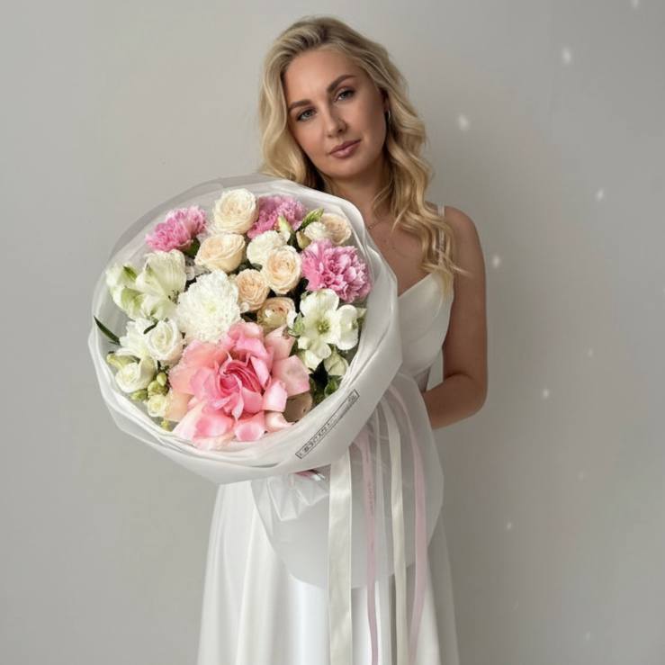| Цветы | альстромерии, диантус, роза, роза кустовая пионовидная, хризантемы, эустома |